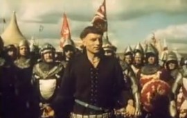 Then, as war follows, the English leaders ostentatiously share the concerns of the common man. Or rather, not quite so ostentatiously, as Harry goes in disguise among the soldiers in their camps on the night before battle, eerily waiting what will surely come next. And then, next morning, as the soldiers assemble for battle, Laurence Olivier leaps on to a wagon to give oratorical force to the case, recalling nothing so much as the inspiration Winston Churchill gave during those dark years.